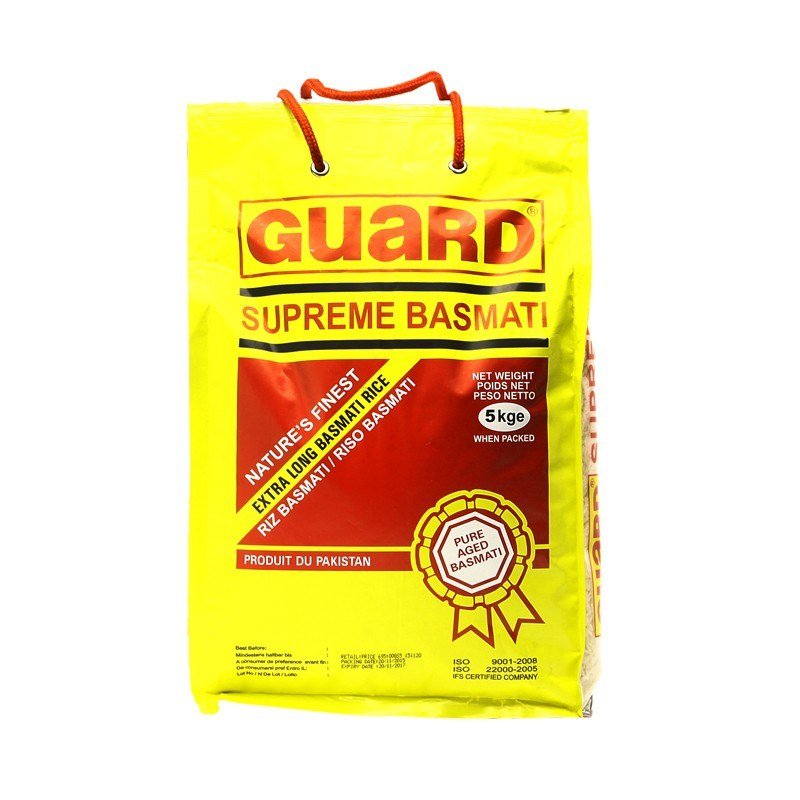 Guard Supreme Basmati, is extra long rice at its best. Bred after years of research and development in the paddy fields of Punjab and irrigated by the melting snow waters of the Himalayas, Guard supreme Basmati is carefully aged for two years to give it the unique and true aroma of pure Basmati. With an average grain length of 7.20mm, Guard Supreme Basmati Rice has exceptional quality that is beyond compare.