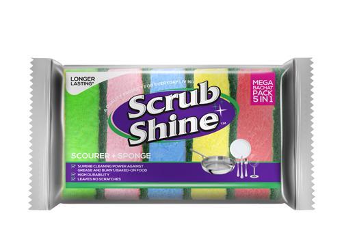 Scrub Shine Scourer+ Sponge provides a dual-action cleaning solution. Its scouring pad side is used for scrubbing and cleaning toughest stains from pots, pans, grills and oven. Whereas, the sponge side is used for cleaning delicate items like glassware and dishes. The Nail Saver Scourer Sponge provides an easy grip and helps to protect your nails.